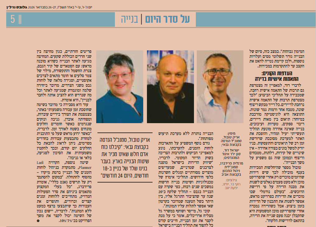 בכתבה שפורסמה בגלובס נדל”ן בנושא התארכות משך הבנייה בישראל, הובאה התייחסותה של מרגלית מוסה פרידברג, סמנכ”לית ניהול תכנון ומערכים בחברת AVIV. בכתבה מוסבר כי העלייה בהיקף הבנייה לגובה, המחסור בכוח אדם מיומן והפגיעה בשדרת הניהול באתרי הבנייה תרמו להארכת לוחות הזמנים בענף. פרידברג מדגישה כי פרויקטים רבי-קומות דורשים רמת תכנון, תיאום וביצוע מורכבת בהרבה, ומציינת […]